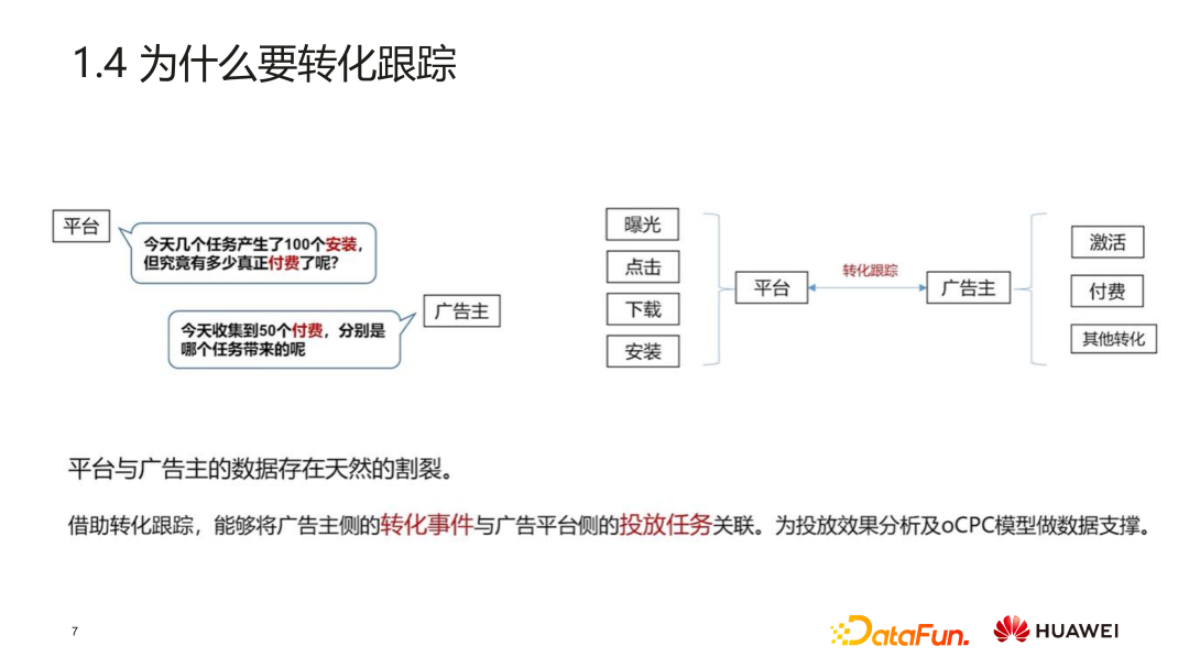 我们为什么要用转化跟踪技术?因为平台和广告主的数据存在天然的割裂。举例来说,平台只知道有几个任务产生了100个安装,但是究竟有多少真正付费了,平台是不知道的;而广告主恰恰知道今天收集到了50个付费,但分别是哪个任务带来的,广告主也是不知道的。