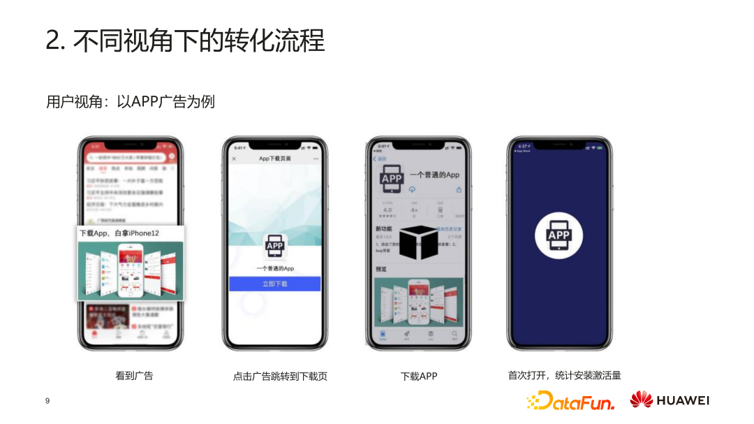 在用户视角下,以APP广告为例。在用户看来是以下4个简单的页面,首先用户会看到广告,当用户对该广告感兴趣时,会点击广告跳转到下载页,进行APP的下载,然后首次打开,统计安装和激活量。