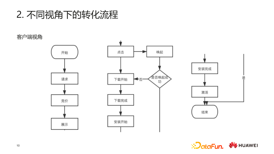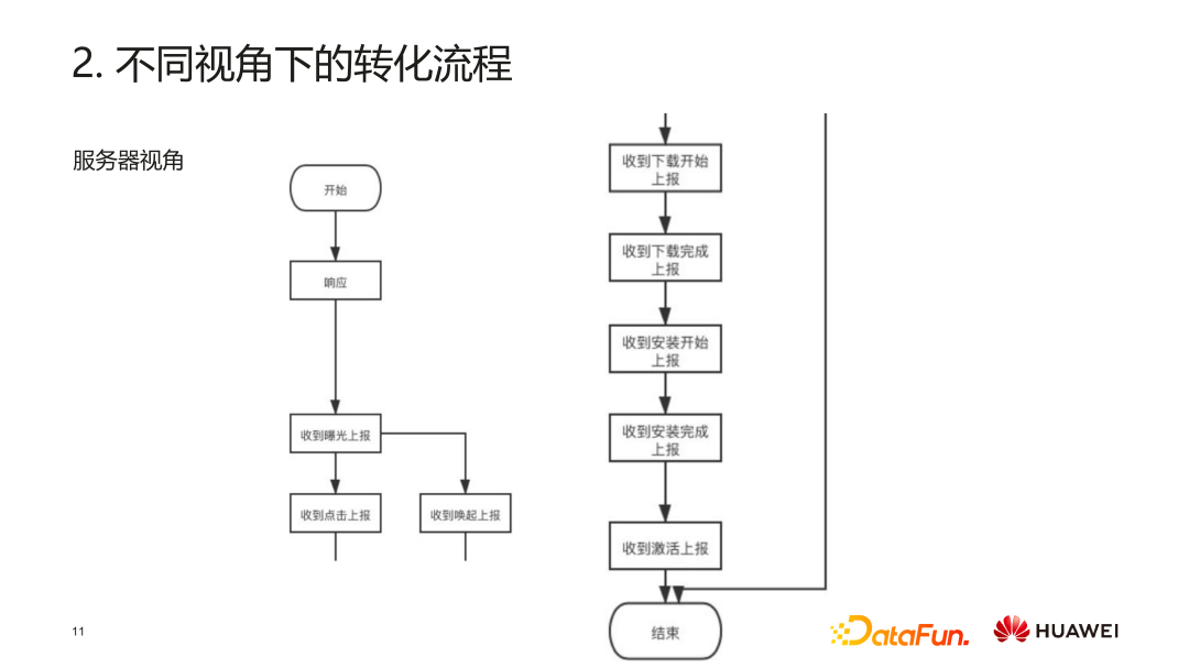 在服务器视角下,服务器需要与客户端进行配合。服务器收到响应之后,将进行一系列的请求的监控,包括收到曝光事件、点击事件、下载开始事件、下载完成事件、安装开始事件、安装完成事件以及激活事件等,都需要服务器进行采集记录。激活完成之后,整个转化流程就结束了。