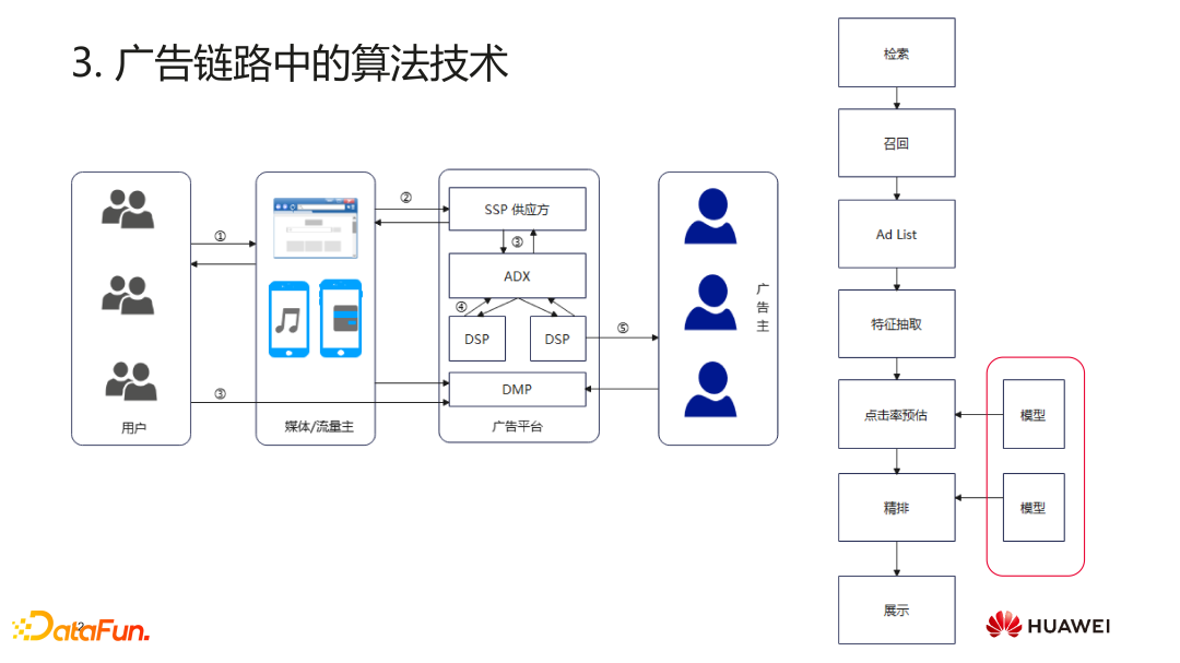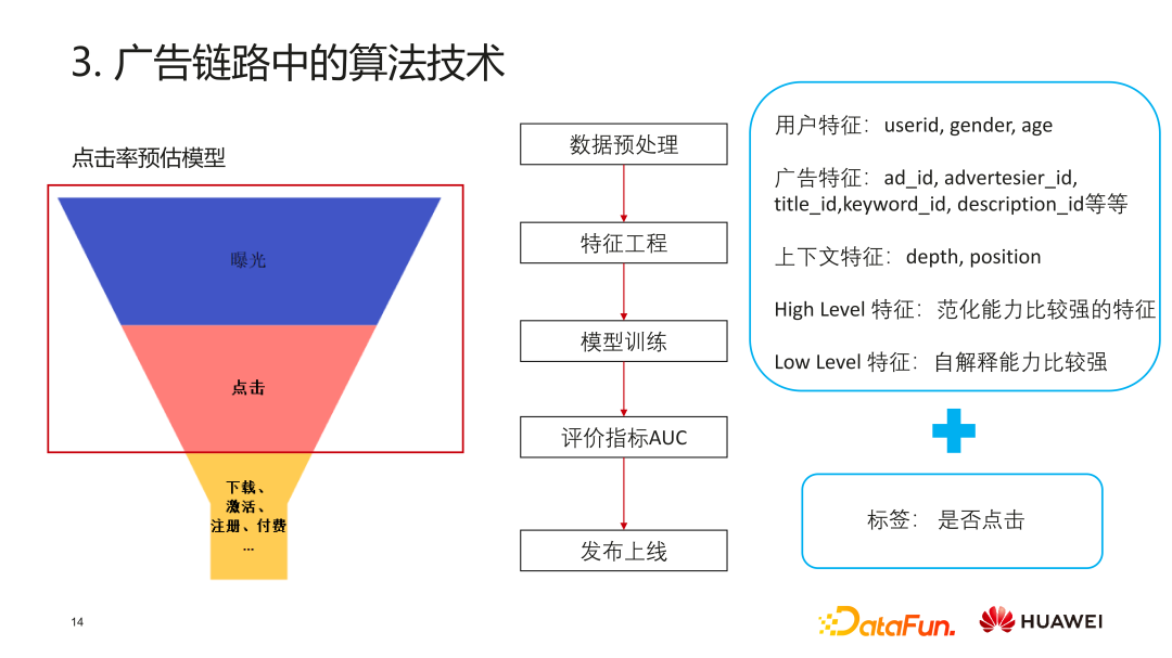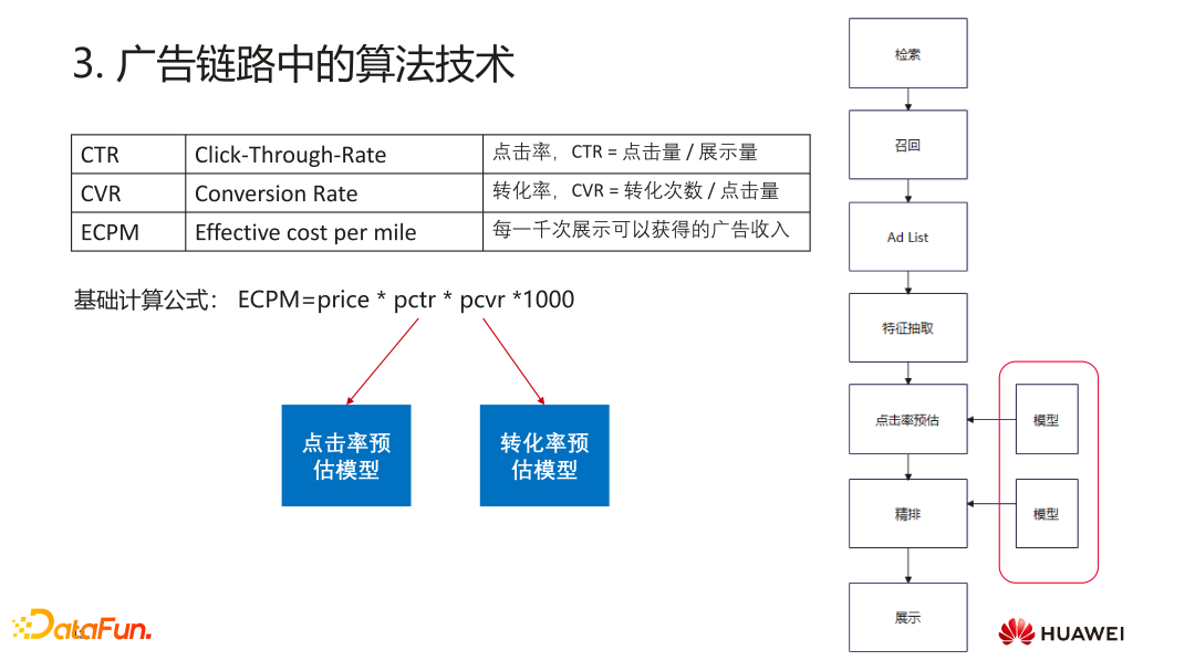 对广告而言,大致经历了检索、召回、特征抽取,模型预估,最后展示给用户。其中有两个最重要的模型,一个是点击率预估模型,一个是转化率预估模型。