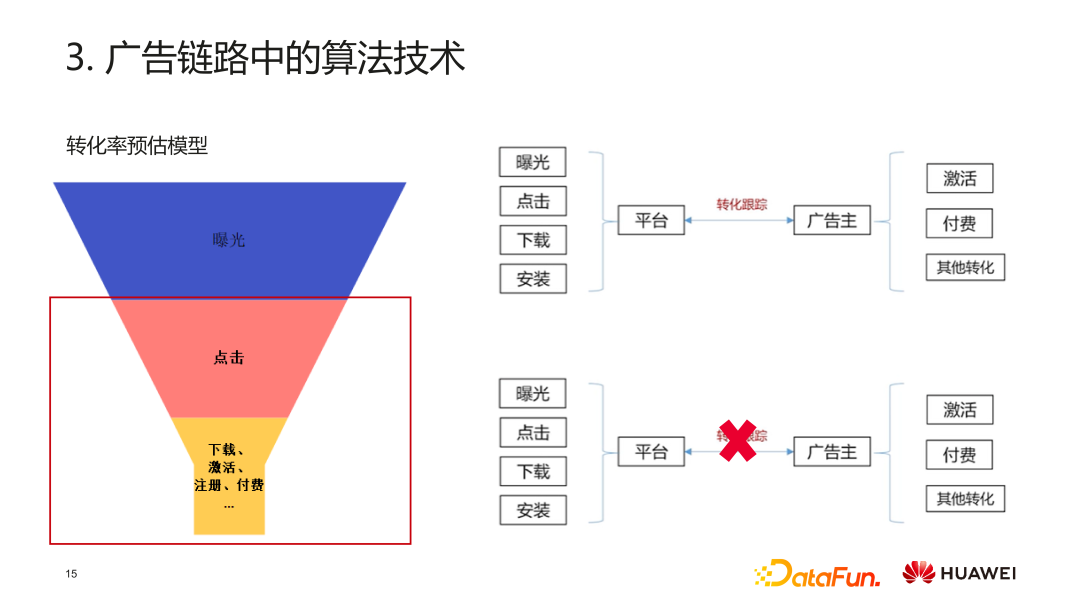 转化率预估模型是大家所说的金牌模型,用到的数据主要是更后端的数据,因为用户发生的转化行为是广告链路中比较深的一个链路,用到的是点击数据和转化数据,其中转化数据包括下载、激活、注册、付费等行为。