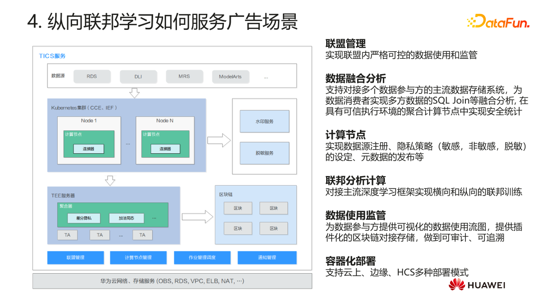 纵向联盟学习我们主要是依托于TICS服务完成,TICS全称是可信智能计算服务,产品架构图如上图所示。TICS基于多方安全计算以及区块链等技术,实现了数据在存储、流通和计算过程中端到端的安全和可审计。它主要提供如下一些功能,如联盟管理、数据融合分析、计算节点、联邦分析计算、数据使用监管和容器化部署。