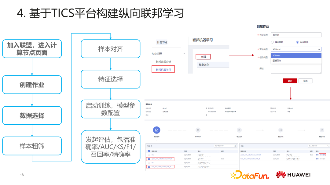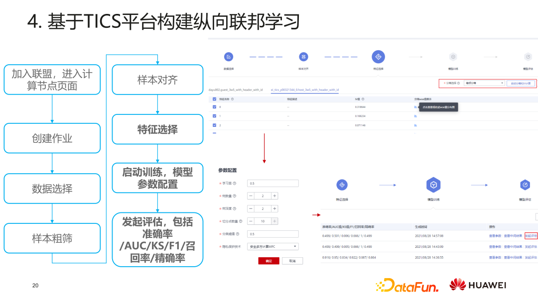 在样本对齐之后,就可以进行特征选择,并且启动训练,配置模型参数,发起评估,包括准确率、AUC、KS、F1、召回率等各项指标的评估。