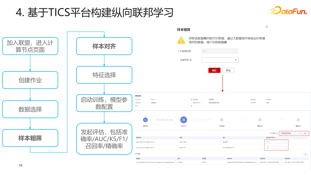 在作业类型选择完成之后,就会进行样本初筛和样本对齐。纵向联邦学习第一个过程就是要进行PSI隐私交集,找出共同的用户群体。不同的参与方其用户量天然就不一样,比如有的参与方用户量达到了亿,有的参与方则只有百万或者几万等等。为了加速求交过程,我们首先要进行样本粗筛,然后再进行PSI样本对齐。