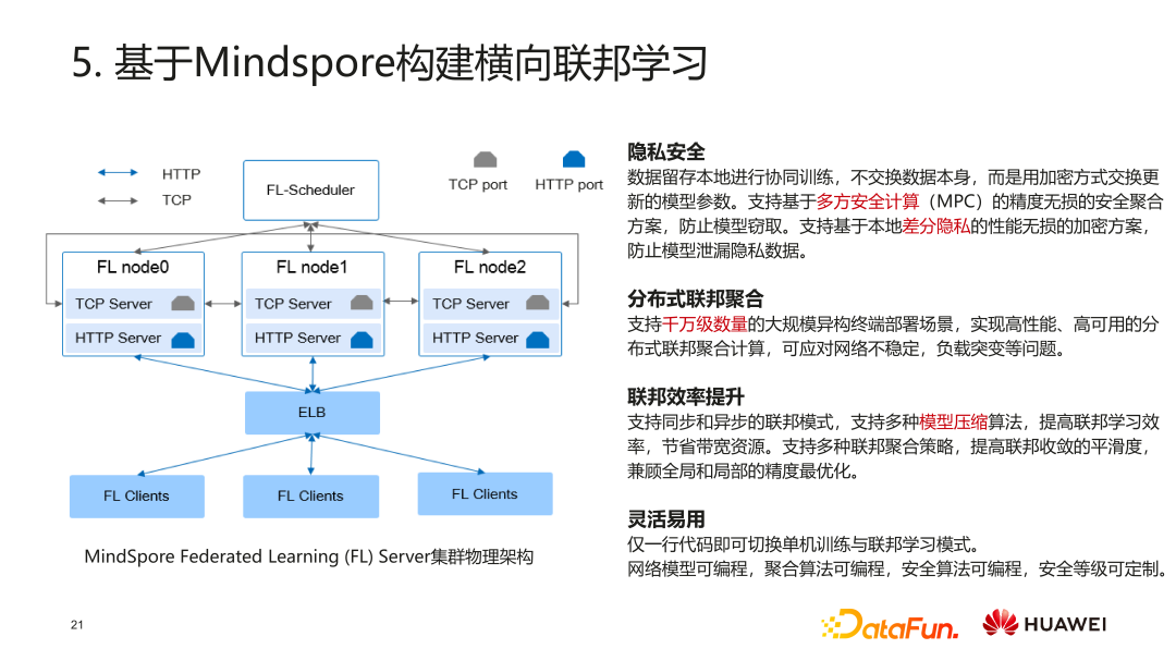整个Mindspore的框架架构如上图所示,主要分成FL Scheduler和FL Server两个组件。它有如下4个优点: