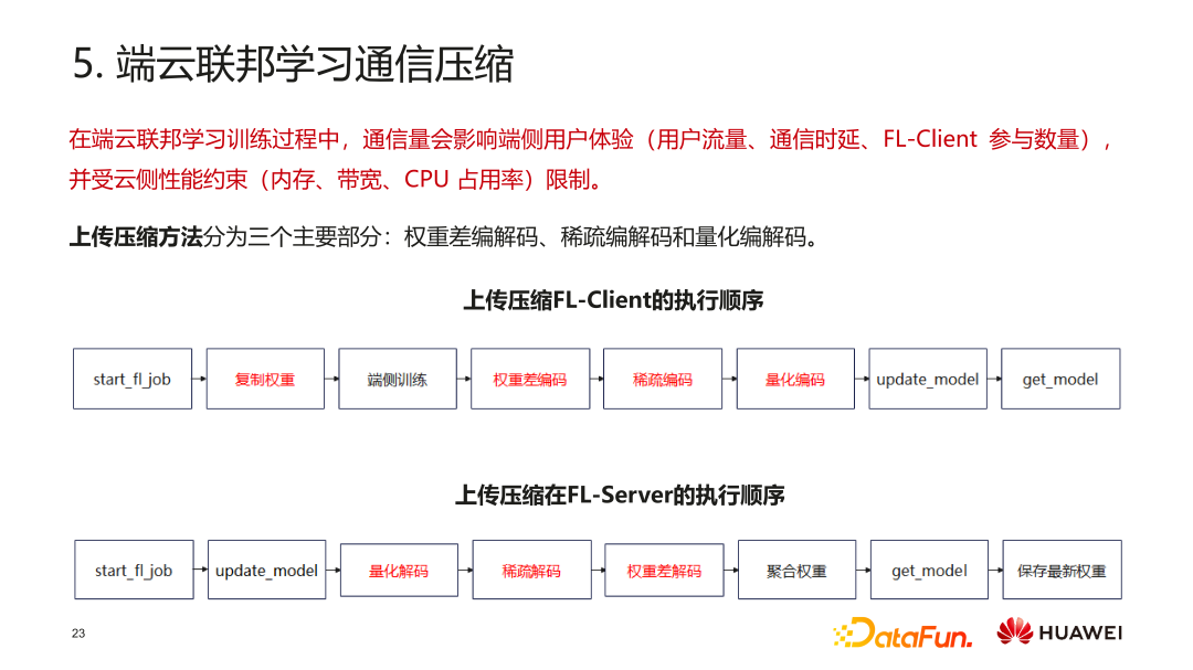 整个上传压缩方法在FL Client的执行顺序是:首先客户端发起了一个联邦学习任务之后,会收集到云侧下发的权重并复制权重,然后开始端侧的训练,经历了权重差编码、稀疏编码、量化编码之后,把训练好的模型update上传服务器。