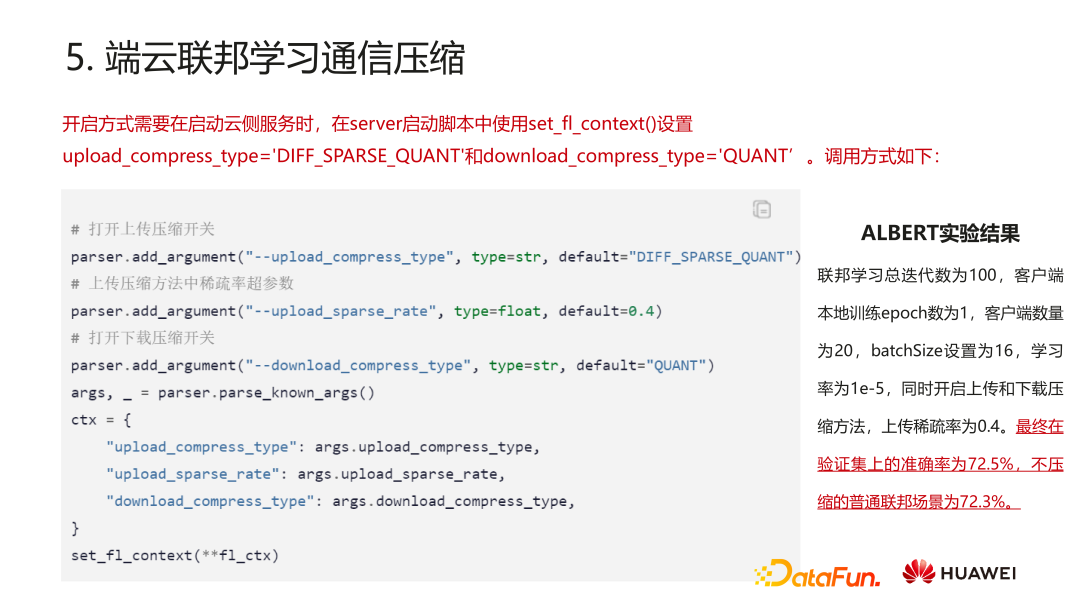 我们以ALBERT的代码为例,提供了如何使用通讯加速功能的示例。在ALBERT的实验结果比较好,最终在验证集上的准确率,不压缩的普通联邦场景为72.3%,压缩后的是72.5%。