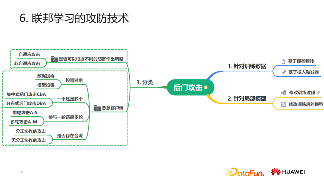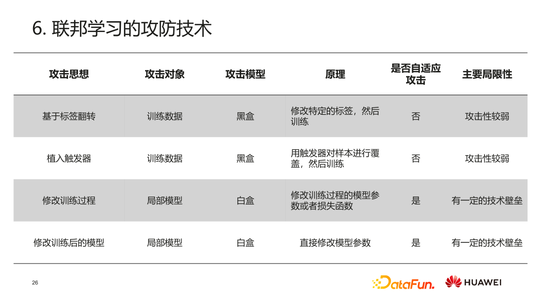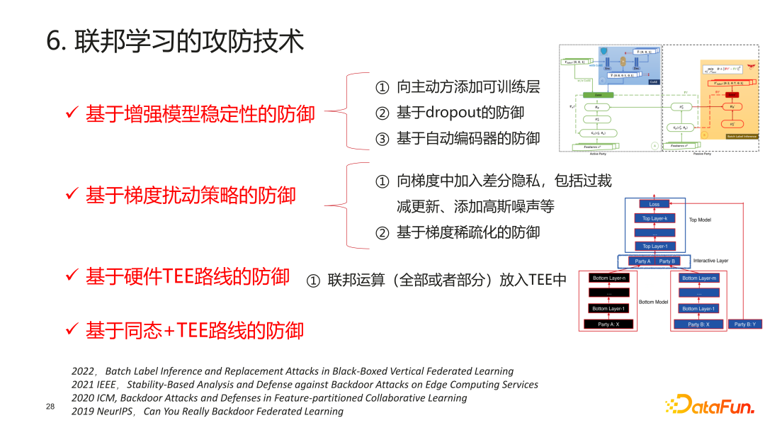 下面我们简单看一下联邦学习的攻防技术。联邦学习涉及大量的通信,不管是纵向还是横向联邦学习,都必然会存在攻击。根据不同训练阶段,我们可以将攻击划分为训练前、训练中以及训练后三个阶段。