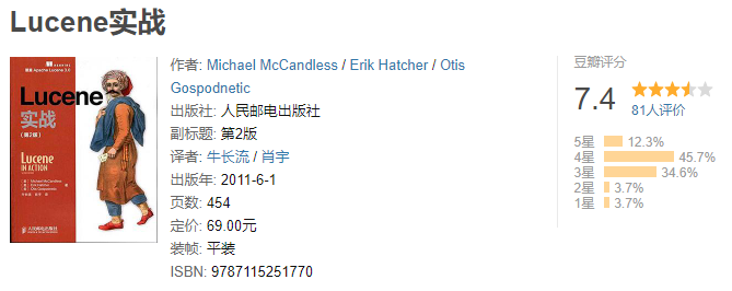 推荐理由 1:作者之一已入职 Elasticsearch。 推荐理由 2:翻译作者是极客时间数学课的作者:黄申博士,翻译还可以,至少比《 Lucene 实战 》翻译好 100 倍。 推荐理由 3:这本书是 Medcl 大神写的序。