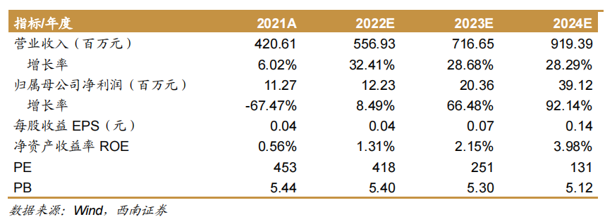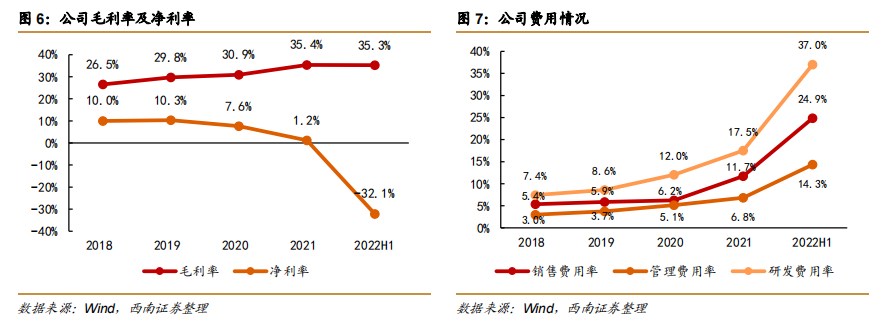 2022年上半年业绩受压,毛利率水平维持稳定。1)从营收端来看,公司2022年上半年营业收入同比下降32.8%,主要由于疫情影响,用户需求放缓、公司产品交付减少。2)从利润端看,公司归母净利润同比下降556.1%,主要系公司坚持产品化转型升级和全国性市场布局,不断加大投入;公司毛利率为35.3%,同比增长0.97 个百分点。3)从费用端来看,2022年上半年公司销售、管理、研发费用率分别为24.9%、14.3%和37.0%,销售、管理、研发费用分别同比增长69.4%、63.4%和45.9%,主要系公司加大研发投入力度、扩大规模,人工、办公费用增加。