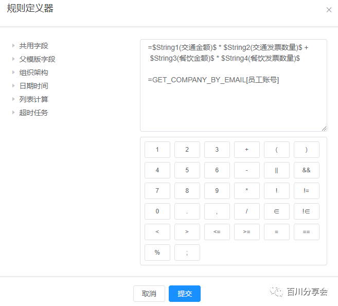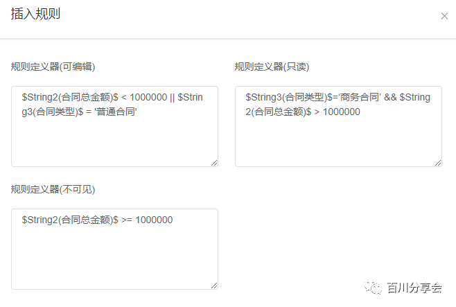 判断类型使用到最多的一种规则,比如合同审批流程,会根据合同金额、类型走不同的审批流程,而且每一个审批节点,也需要动态控制合同金额是否展示、编辑。