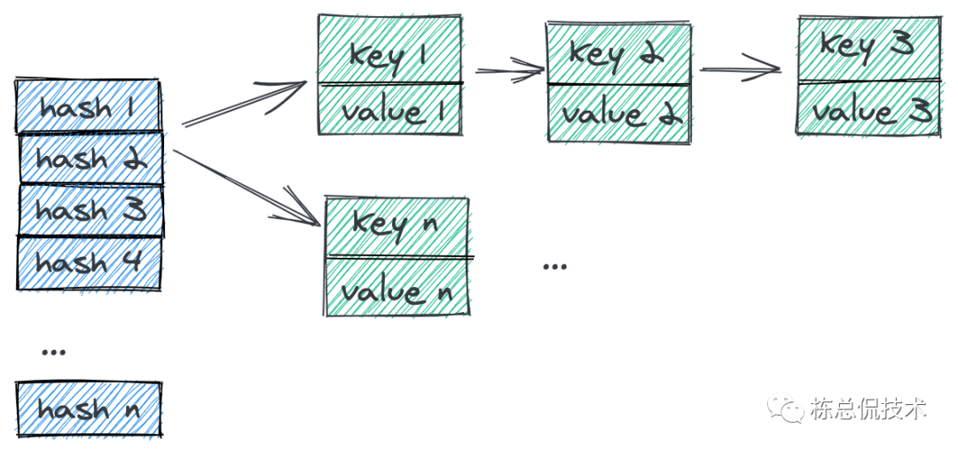 在Mysql系列章节中,我们已经提过hash表,哈希表是一种key-value键值对的存储数据结构。当数据量比较大时,不可避免的出现多个key哈希的结果是相同的,这个时候会拉出一个链表来存储多个value。数据存储示意图如下: