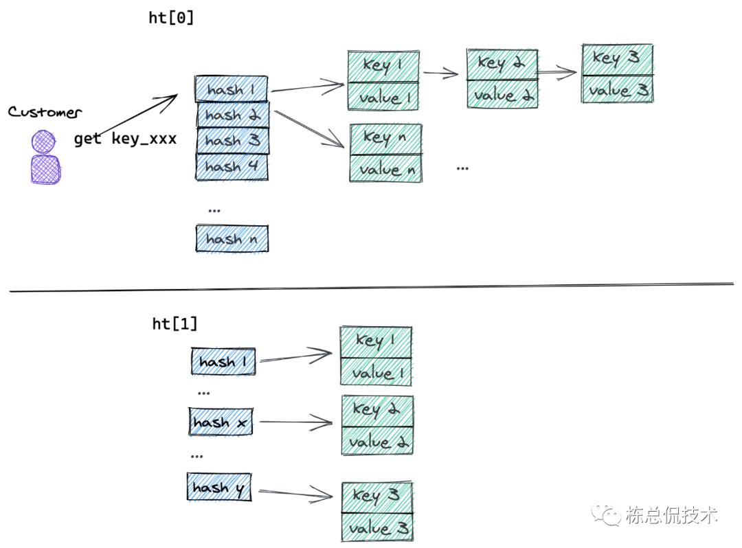 可以看到当用户访问某个key的时候,如果此时ht0正在rehash,那么会把hash0值中对应的所有键值对重新映射到ht1中,这个时候可以会把rehash到不同的hashkey对应的桶中。