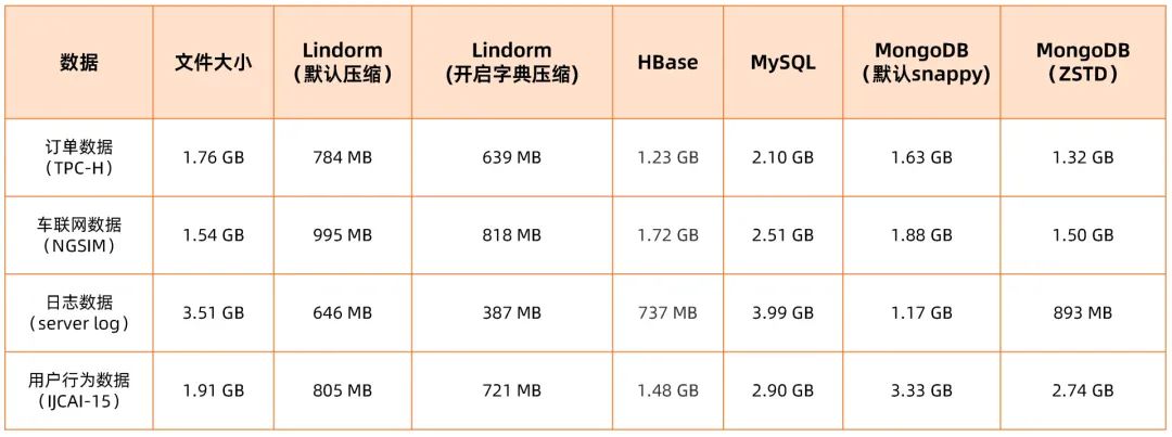 空说无凭,面对不同用户的不同场景,Lindorm究竟能做到多少压缩比?相对于其他开源数据库,Lindorm能有多好的表现?本文特地选取了订单、车联网、日志和用户行为这四个在Lindorm上常见的场景,使用真实的数据集对各个数据库的压缩表现进行了评测。