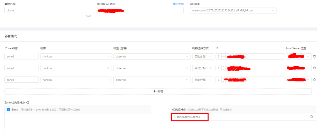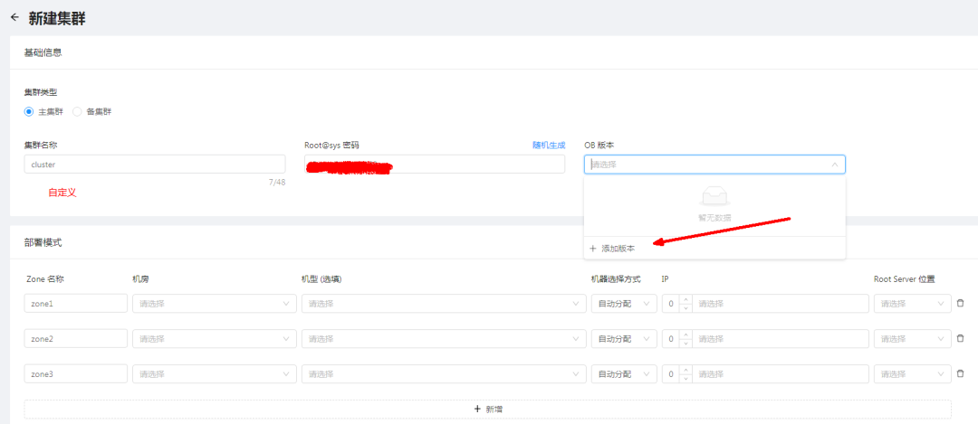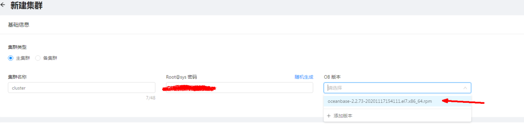手动填写集群名称,随机生成密码(要记住),和选择OB版本