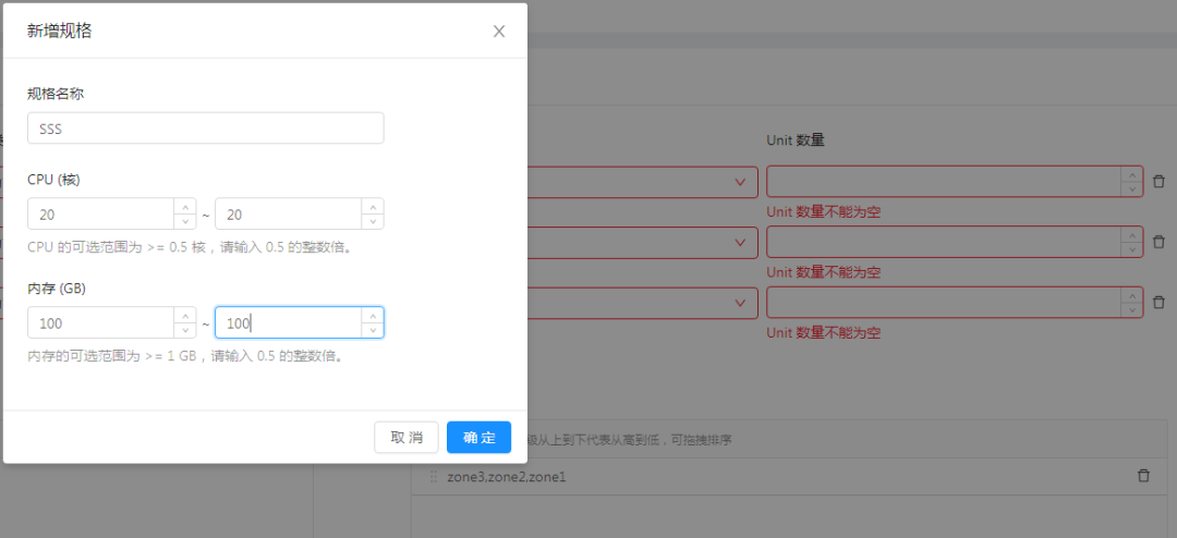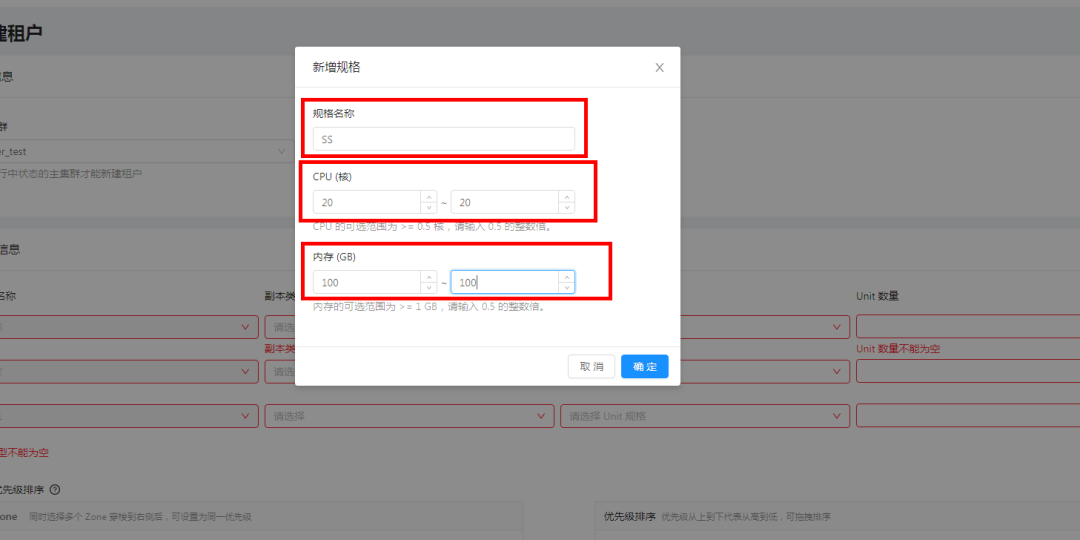 选择集群,租户名称要自定义,新增Unit规格,范围上下给一样的。