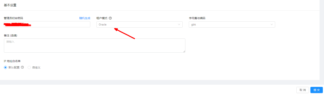 管理员密码选择随机生成,租户这里是Oracle租户,字符编码是GBK,点击提交