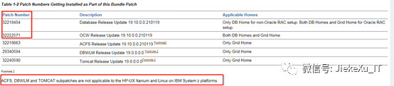 RU 32126842 包含 GI 和 OJVM 是一个大补丁集,适用于安装了 OCW 和 OJVM 的 RAC 环境,当然也适用于单实例环境。里面包含 DB 补丁 32218454,这个可以从同级目录下 README.html 文件看出来。还有值得注意的是惠普和 Linuxone 系统不适用 ACFS,DBWLM and TOMCAT “ACFS, DBWLMand TOMCAT subpatches are not applicable to the HP-UX Itanium and Linux on IBMSystem z platforms” ,安装补丁时请仔细阅读 readme 文档。