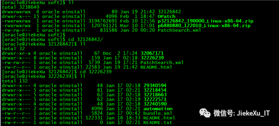 [oracle@JiekeXu etc]$ cat etc/redhat-releaseRed Hat Enterprise Linux Server release 7.4(Maipo)[oracle@JiekeXu etc]$ free -mtotal used free shared buff/cache availableMem: 7822 882 263 2740 6676 3889Swap: 8191 0 8191[oracle@JiekeXu soft]$ ls -ltotal 3238640drwxrwxrwx 4 oracle oinstall 80 Jan19 21:42 32126842drwxr-x--- 15 oracle oinstall 4096 Feb 1 18:47 OPatch-rwxrwxrwx 1 oracle oinstall 3194762691 Feb 10 12:56p32126842_190000_Linux-x86-64.zip-rwxrwxrwx 1 oracle oinstall 120761121 Mar10 17:01 p6880880_122010_Linux-x86-64.zip-rw-rw-r-- 1 oracle oinstall 831586 Jan20 00:20 PatchSearch.xml