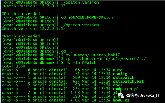 [oracle@JiekeXuOPatch]$ cd $ORACLE_HOME/OPatch[oracle@JiekeXuOPatch]$ ./opatch versionOPatch Version:12.2.0.1.17OPatchsucceeded.[oracle@JiekeXuOPatch]$ cd ..[oracle@JiekeXudbhome_1]$ mv OPatch/ OPatch_bak17[oracle@JiekeXudbhome_1]$ cp -r home/oracle/soft/OPatch/ ./[oracle@JiekeXudbhome_1]$ ls -lh OPatch[oracle@JiekeXudbhome_1]$ pwd/opt/oracle/product/19c/dbhome_1[oracle@JiekeXudbhome_1]$ cd OPatch[oracle@JiekeXuOPatch]$ ./opatch versionOPatchVersion: 12.2.0.1.24OPatchsucceeded.