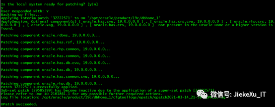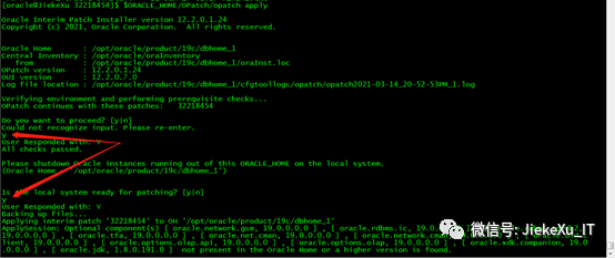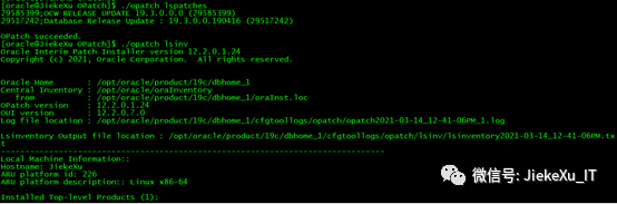 [oracle@JiekeXu32226239]$ cd 32222571[oracle@JiekeXu32222571]$ pwd/home/oracle/soft/32126842/32226239/32222571[oracle@JiekeXu32222571]$ lltotal 84drwxr-x--- 3 oracle oinstall 21 Jan 17 02:21 customdrwxr-x--- 3 oracle oinstall 20 Jan 17 02:21 etcdrwxr-x---20 oracle oinstall 217 Jan 17 02:19files-rw-r--r-- 1 oracle oinstall 84079 Jan 17 02:21README.txt[oracle@JiekeXu32222571]$[oracle@JiekeXu32222571]$ $ORACLE_HOME/OPatch/opatch applyOracleInterim Patch Installer version 12.2.0.1.24Copyright(c) 2021, Oracle Corporation. All rightsreserved.Oracle Home :/opt/oracle/product/19c/dbhome_1