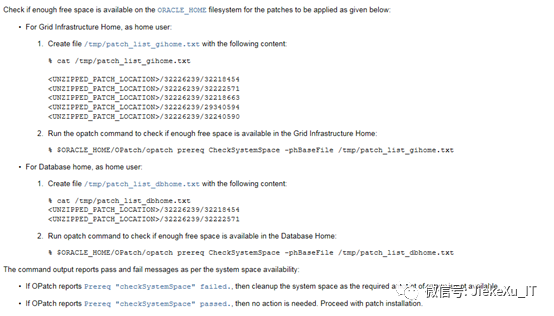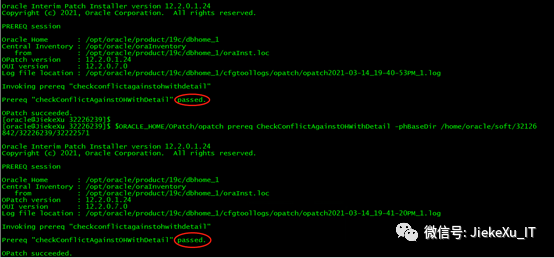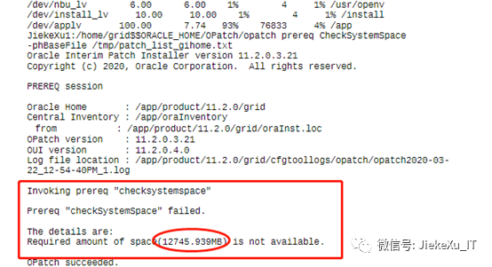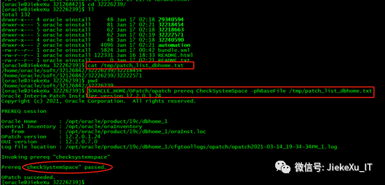 [oracle@JiekeXu OPatch]$ df -hFilesystem Size Used Avail Use% Mounted on/dev/mapper/rhel-root 71G 31G 41G 43%devtmpfs 3.9G 0 3.9G 0% devtmpfs 3.9G 12K 3.9G 1% dev/shmtmpfs 3.9G 297M 3.6G 8% runtmpfs 3.9G 0 3.9G 0% sys/fs/cgroup/dev/sda2 1014M 143M 872M 15% boot/dev/mapper/rhel-home 60G 9.1G 51G 16% hometmpfs 783M 0 783M 0% run/user/0cat tmp/patch_list_dbhome.txt/home/oracle/soft/32126842/32226239/32218454/home/oracle/soft/32126842/32226239/32222571[oracle@JiekeXu 32226239]$ pwd/home/oracle/soft/32126842/32226239[oracle@JiekeXu 32226239]$ $ORACLE_HOME/OPatch/opatchprereq CheckSystemSpace -phBaseFile tmp/patch_list_dbhome.txtOracle Interim Patch Installer version12.2.0.1.24Copyright (c) 2021, OracleCorporation. All rights reserved.PREREQ sessionOracle Home : opt/oracle/product/19c/dbhome_1Central Inventory :/opt/oracle/oraInventoryfrom :/opt/oracle/product/19c/dbhome_1/oraInst.locOPatch version : 12.2.0.1.24OUI version : 12.2.0.7.0Log file location :/opt/oracle/product/19c/dbhome_1/cfgtoollogs/opatch/opatch2021-03-14_19-34-34PM_1.logInvoking prereq"checksystemspace"Prereq "checkSystemSpace" passed.OPatch succeeded.