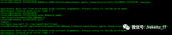 JiekeXu1:/u01/app/19.0.0.0/grid# u01/app/19.0.0.0/grid/OPatch/opatchauto apply u01/soft/32126842/32226239/ -analyze
