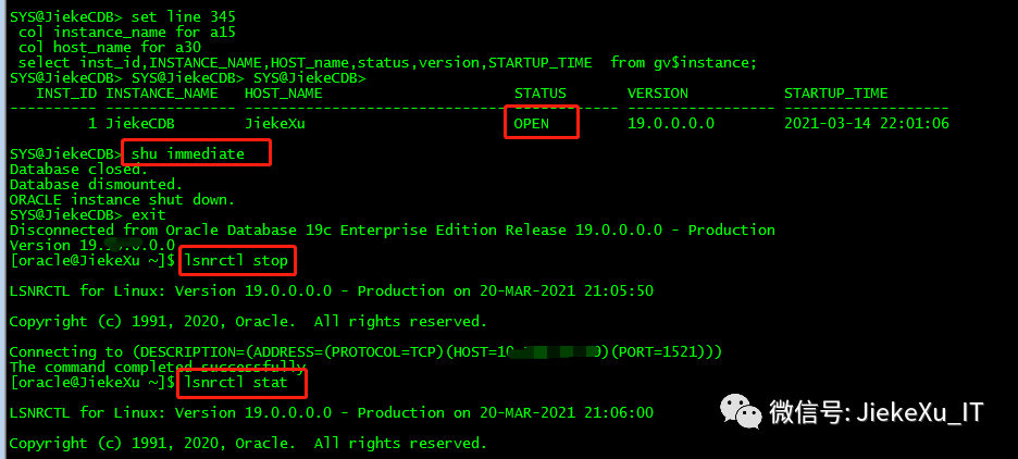 [oracle@JiekeXu32126842]$ sqlplus as sysdbaSQL*Plus:Release 19.0.0.0.0 - Production on Sun Mar 14 11:56:00 2021Version19.3.0.0.0Copyright(c) 1982, 2019, Oracle. All rightsreserved.Connectedto:OracleDatabase 19c Enterprise Edition Release 19.0.0.0.0 - ProductionVersion19.3.0.0.0SYS@JiekeCDB>shu immediateDatabaseclosed.Databasedismounted.ORACLEinstance shut down.SYS@JiekeCDB>exitDisconnectedfrom Oracle Database 19c Enterprise Edition Release 19.0.0.0.0 - ProductionVersion19.3.0.0.0[oracle@JiekeXu32126842]$ echo $ORACLE_HOME/opt/oracle/product/19c/dbhome_1