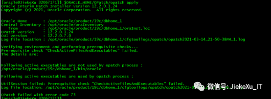 [oracle@JiekeXu32067171]$ pwd/home/oracle/soft/32126842/32067171[oracle@JiekeXu32067171]$ $ORACLE_HOME/OPatch/opatch applyOracleInterim Patch Installer version 12.2.0.1.24Copyright(c) 2021, Oracle Corporation. All rightsreserved.OracleHome :/opt/oracle/product/19c/dbhome_1CentralInventory : opt/oracle/oraInventoryfrom :/opt/oracle/product/19c/dbhome_1/oraInst.locOPatchversion : 12.2.0.1.24OUIversion : 12.2.0.7.0Log filelocation :/opt/oracle/product/19c/dbhome_1/cfgtoollogs/opatch/opatch2021-03-14_21-50-38PM_1.logVerifyingenvironment and performing prerequisite checks...Prerequisitecheck "CheckActiveFilesAndExecutables" failed.Thedetails are:Followingactive executables are not used by opatch process :/opt/oracle/product/19c/dbhome_1/bin/oracleFollowingactive executables are used by opatch process :UtilSessionfailed: Prerequisite check "CheckActiveFilesAndExecutables" failed.Log filelocation: opt/oracle/product/19c/dbhome_1/cfgtoollogs/opatch/opatch2021-03-14_21-50-38PM_1.logOPatch failed with error code 73[oracle@JiekeXu32067171]$ $ORACLE_HOME/OPatch/opatch applyOracleInterim Patch Installer version 12.2.0.1.24Copyright(c) 2021, Oracle Corporation. All rightsreserved.OracleHome :/opt/oracle/product/19c/dbhome_1CentralInventory : opt/oracle/oraInventoryfrom :/opt/oracle/product/19c/dbhome_1/oraInst.locOPatchversion : 12.2.0.1.24OUIversion : 12.2.0.7.0Log filelocation :/opt/oracle/product/19c/dbhome_1/cfgtoollogs/opatch/opatch2021-03-14_21-53-32PM_1.logVerifyingenvironment and performing prerequisite checks...--------------------------------------------------------------------------------Start OOPby Prereq process.LaunchOOP...OracleInterim Patch Installer version 12.2.0.1.24Copyright(c) 2021, Oracle Corporation. All rightsreserved.OracleHome :/opt/oracle/product/19c/dbhome_1CentralInventory : opt/oracle/oraInventoryfrom :/opt/oracle/product/19c/dbhome_1/oraInst.locOPatchversion : 12.2.0.1.24OUIversion : 12.2.0.7.0Log filelocation :/opt/oracle/product/19c/dbhome_1/cfgtoollogs/opatch/opatch2021-03-14_21-53-44PM_1.logVerifyingenvironment and performing prerequisite checks...OPatchcontinues with these patches: 32067171Do youwant to proceed? [y|n]yUserResponded with: YAllchecks passed.Pleaseshutdown Oracle instances running out of this ORACLE_HOME on the local system.(OracleHome = '/opt/oracle/product/19c/dbhome_1')Is thelocal system ready for patching? [y|n]yUserResponded with: YBackingup files...Applyinginterim patch '32067171' to OH '/opt/oracle/product/19c/dbhome_1'Patchingcomponent oracle.javavm.server, 19.0.0.0.0...Patchingcomponent oracle.javavm.server.core, 19.0.0.0.0...Patchingcomponent oracle.rdbms.dbscripts, 19.0.0.0.0...Patchingcomponent oracle.rdbms, 19.0.0.0.0...Patchingcomponent oracle.javavm.client, 19.0.0.0.0...Patch32067171 successfully applied.Log filelocation:/opt/oracle/product/19c/dbhome_1/cfgtoollogs/opatch/opatch2021-03-14_21-53-44PM_1.logOPatch succeeded.--== OJVM 也需要跑 datapatch 脚本