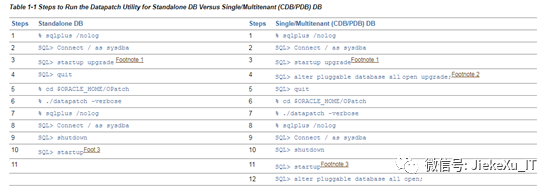 --执行 datapatch 脚本[oracle@JiekeXuOPatch]$ ./datapatch -verboseSQLPatching tool version 19.10.0.0.0 Production on Sun Mar 14 21:26:36 2021Copyright(c) 2012, 2020, Oracle. All rightsreserved.Log filefor this invocation:/opt/oracle/cfgtoollogs/sqlpatch/sqlpatch_21224_2021_03_14_21_26_36/sqlpatch_invocation.logConnectingto database...OKGatheringdatabase info...doneNote: Datapatch will only apply or rollback SQLfixes for PDBsthat are in an open state, no patcheswill be applied to closed PDBs.Please refer to Note: Datapatch:Database 12c Post Patch SQL Automation(Doc ID 1585822.1)Bootstrappingregistry and package to current versions...doneDeterminingcurrent state...doneCurrentstate of interim SQL patches:No interim patches foundCurrentstate of release update SQL patches:Binary registry:19.10.0.0.0 Release_Update 210108185017:InstalledPDB CDB$ROOT:Applied 19.3.0.0.0 Release_Update190410122720 successfully on 18-JUN-20 02.28.12.207114 PMPDB JIEKEPDB:Applied 19.3.0.0.0 Release_Update190410122720 successfully on 18-JUN-20 02.33.11.348597 PMPDB JIEKEPDB1:Applied 19.3.0.0.0 Release_Update190410122720 successfully on 18-JUN-20 02.33.11.348597 PMPDB PDB$SEED:Applied 19.3.0.0.0 Release_Update190410122720 successfully on 18-JUN-20 02.33.11.348597 PMAddingpatches to installation queue and performing prereq checks...doneInstallationqueue:For the following PDBs: CDB$ROOT PDB$SEEDJIEKEPDB JIEKEPDB1No interim patches need to be rolled backPatch 32218454 (Database Release Update :19.10.0.0.210119 (32218454)):Apply from 19.3.0.0.0 Release_Update190410122720 to 19.10.0.0.0 Release_Update 210108185017No interim patches need to be appliedInstallingpatches...Patchinstallation complete. Total patchesinstalled: 4Validatinglogfiles...donePatch 32218454apply (pdb CDB$ROOT): SUCCESSlogfile:/opt/oracle/cfgtoollogs/sqlpatch/32218454/24018797/32218454_apply_JIEKECDB_CDBROOT_2021Mar14_21_27_00.log(no errors)Patch32218454 apply (pdb PDB$SEED): SUCCESSlogfile: /opt/oracle/cfgtoollogs/sqlpatch/32218454/24018797/32218454_apply_JIEKECDB_PDBSEED_2021Mar14_21_30_35.log(no errors)Patch32218454 apply (pdb JIEKEPDB): SUCCESSlogfile:/opt/oracle/cfgtoollogs/sqlpatch/32218454/24018797/32218454_apply_JIEKECDB_JIEKEPDB_2021Mar14_21_30_34.log(no errors)Patch32218454 apply (pdb JIEKEPDB1): SUCCESSlogfile:/opt/oracle/cfgtoollogs/sqlpatch/32218454/24018797/32218454_apply_JIEKECDB_JIEKEPDB1_2021Mar14_21_30_34.log(no errors)SQL Patching tool complete on Sun Mar 14 21:34:51 2021--执行 utlrp.sql 编译无效对象cd $ORACLE_HOME/rdbms/admin/SYS@JiekeCDB> @utlrp.sql