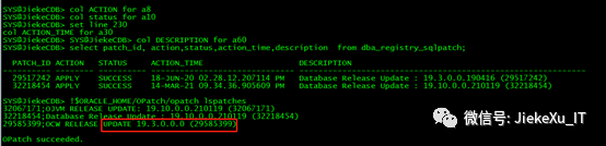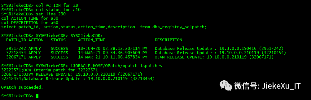 SYS@JiekeCDB>col ACTION for a8SYS@JiekeCDB>col status for a10SYS@JiekeCDB>set line 230SYS@JiekeCDB>col ACTION_TIME for a30SYS@JiekeCDB>col DESCRIPTION for a60SYS@JiekeCDB>select patch_id, action,status,action_time,description from dba_registry_sqlpatch;PATCH_ID ACTION STATUS ACTION_TIME DESCRIPTION------------------ ---------- ------------------------------ ------------------------------------------------------------29517242 APPLY SUCCESS 18-JUN-20 02.28.12.207114 PM Database Release Update : 19.3.0.0.190416 (29517242)32218454 APPLY SUCCESS 14-MAR-21 09.34.36.905609 PM Database Release Update : 19.10.0.0.210119 (32218454)SYS@JiekeCDB>!$ORACLE_HOME/OPatch/opatch lspatches32067171;OJVM RELEASE UPDATE: 19.10.0.0.210119 (32067171)32218454;Database Release Update : 19.10.0.0.210119 (32218454)29585399;OCW RELEASE UPDATE 19.3.0.0.0 (29585399)OPatch succeeded.