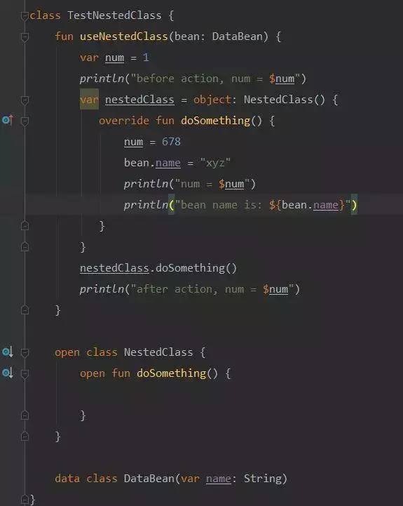 public final void useNestedClass(@NotNull final TestNestedClass.DataBean bean) { Intrinsics.checkParameterIsNotNull(bean, "bean"); final IntRef num = new IntRef();//---1 num.element = 1;//---2 String var3 = "before action, num = " + num.element; System.out.println(var3); <undefinedtype> nestedClass = new TestNestedClass.NestedClass() { public void doSomething() { num.element = 678;//---3 bean.setName("xyz"); String var1 = "num = " + num.element; System.out.println(var1); var1 = "bean name is: " + bean.getName(); System.out.println(var1); } }; nestedClass.doSomething(); String var4 = "after action, num = " + num.element;//---4 System.out.println(var4); }