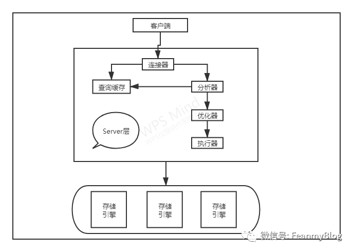 Server层包括连接器、查询缓存、分析器、优化器、执行器 所有的内置函数以及所有跨存储引擎的功能都在此层实现