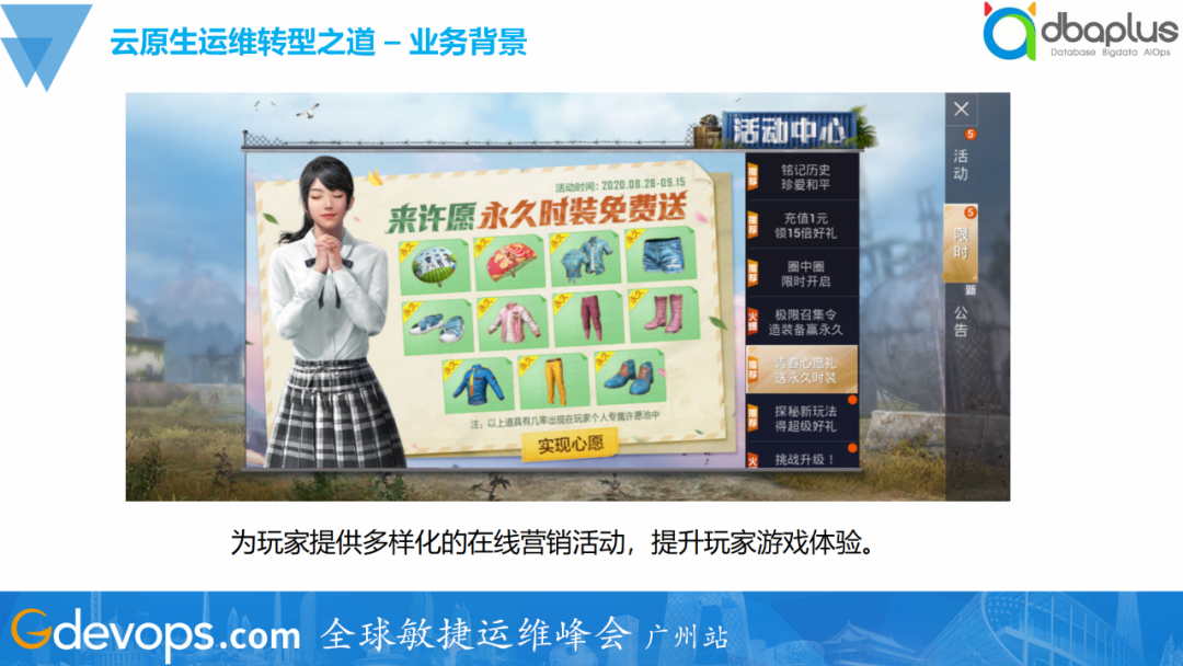 如果大家有玩过游戏的话,对这个界面应该不陌生。我们团队主要负责腾讯内部游戏营销活动的运维支撑,在线营销活动除了为玩家提升游戏体验以外,也为游戏项目组在拉新、活跃,甚至是购买道具,都提供相关的营销活动、运营事件等商业化的支持。