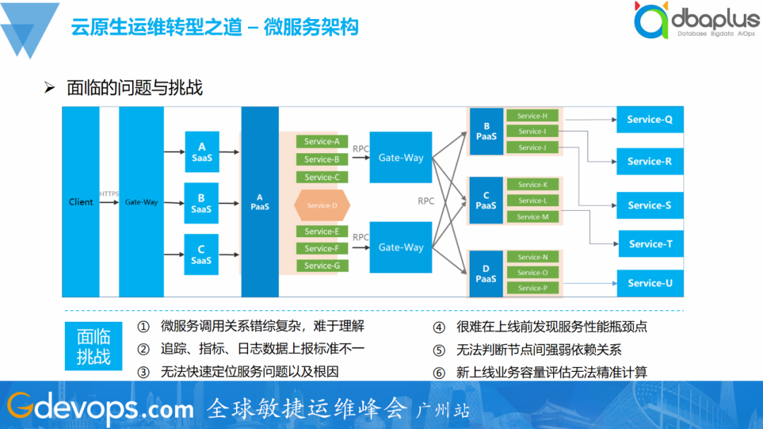 这是我们的一个技术架构。从这个技术架构里我们可以看出,云原生已经变成一个大趋势了,我们团队95%以上都实现了微服务化。微服务化改变了开发的交付模式,同时也给运维带来了很大的变化,我个人的感受是挑战大于变化。以下6点是我认为现阶段我们面临的最大的挑战:
