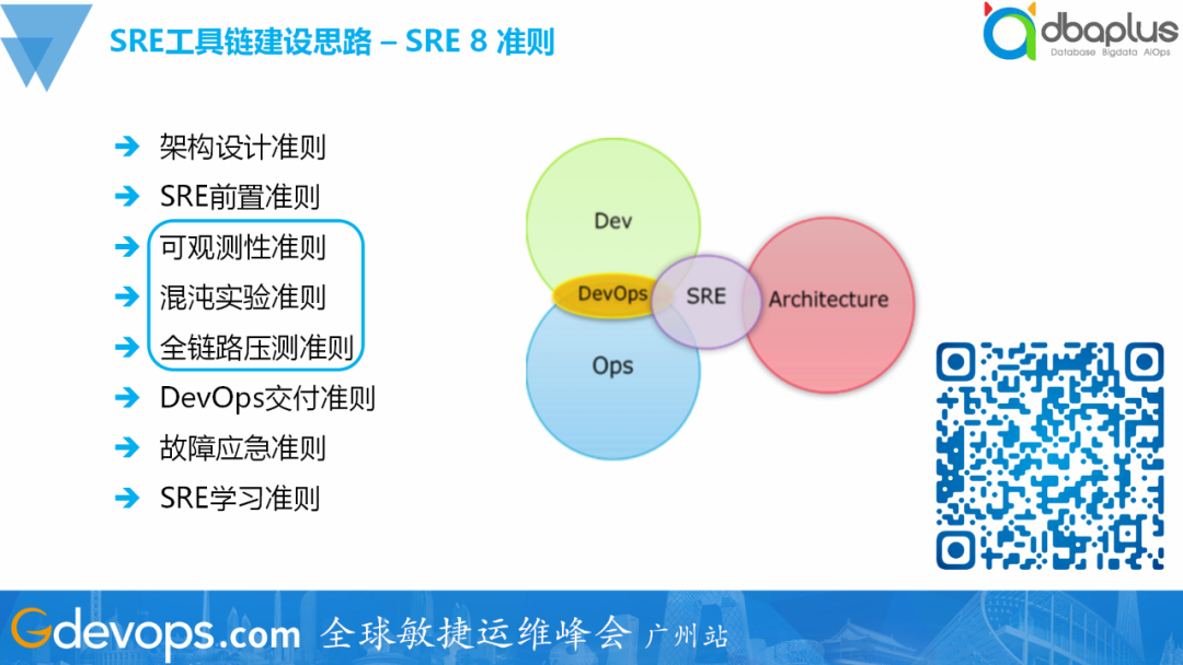 有了目标之后,我们还需要一些指导的原则,告诉我们应该怎么做。这里我也提炼总结出了8点,我们内部叫SRE 8 准则,今天我会重点把核心三点(蓝色框)提出来讲,其它更多准则说明可以扫描右下角的二维码查看。