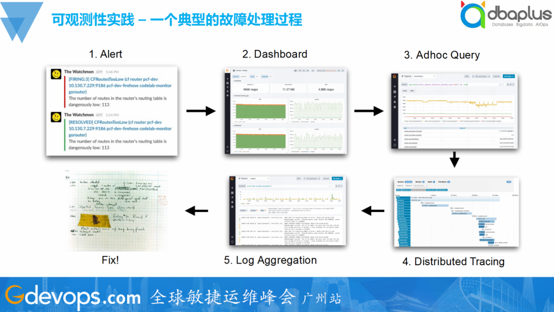 接下来我们讲的第一个应用是可观测性,举一个很简单的例子,就是我们运维经常碰到处理故障的一个典型过程。通常我们收到告警,第一步肯定是要去看Dashboard里是哪个曲线和图表出现了明显的异常,然后找出某个时间段异常发生的具体表现,是否有周期性,是哪个指标发生了异常,再切换到下一步链路追踪,分解出这个时间段,某个接口和方法是否延迟拉高了或报错了,通过追踪的方式定位。最后一步则是通过日志分析导致这个函数方法出现异常的根因,定位出来后即可解决这个问题。作为一个普通运维人员,经常按这个套路去定位与解决某个问题,在整个过程当中用到了指标、日志和追踪三个能力,实际上这三个能力就构成了可观测性的三大支柱。