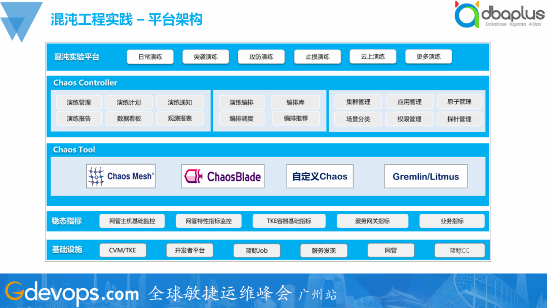 这是我们的整体架构,这部分我们跟社区合作的比较多,比如PingCAP的Chaos Mesh,我们也参与了共建,所以很多原子是开放的,平台能力也很成熟,基本上用于做一些能力的封装,比如上面的编排、演练、模板,官方也带了一个简单的管理端,如果要求不高可以直接用。