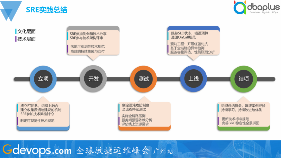 最后总结SRE实践里的几个过程。我们从立项到结项,通过技术与文化两个层面落地。