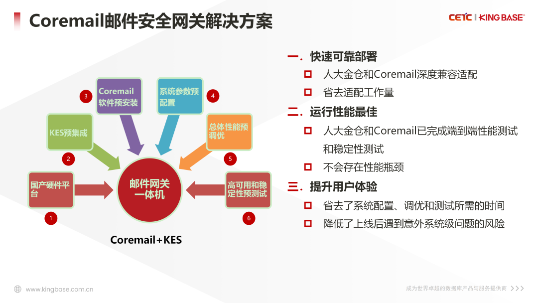 在此背景下,人大金仓携手邮件行业排头兵Coremail、优秀CPU厂商飞腾打造信创邮件安全解决方案,共同推出基于人大金仓数据库产品KES的邮件安全网关信创一体机。