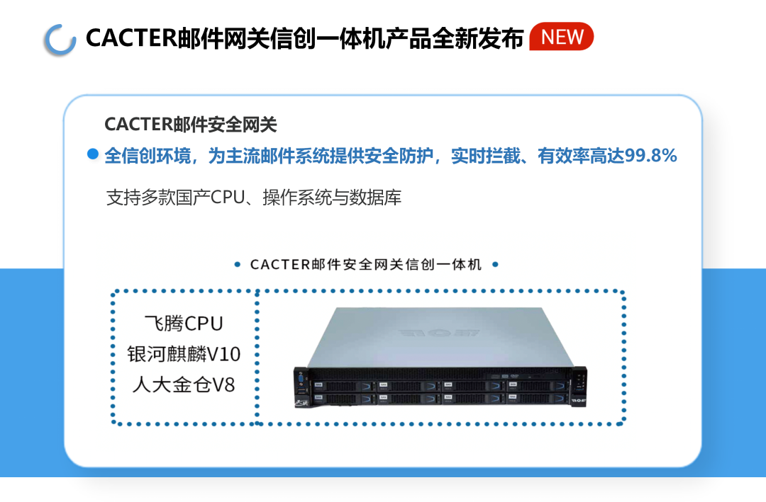 近日,人大金仓联合Coremail、飞腾重磅发布信创邮件安全解决方案,共同推出CACTER邮件安全信创网关一体机。