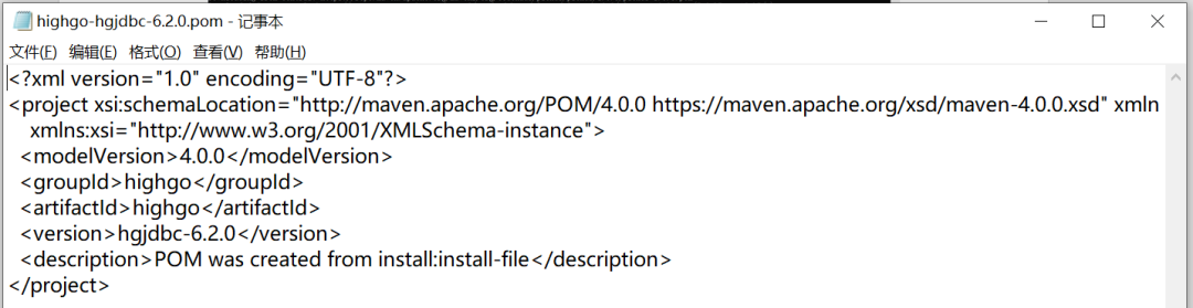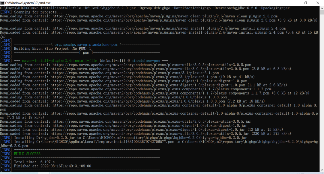 mvn install:install-file -Dfile=D:\hgjdbc-6.2.0.jar -DgroupId=highgo -DartifactId=highgo -Dversion=hgjdbc-6.2.0 -Dpackaging=jar