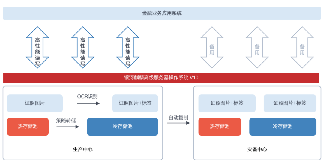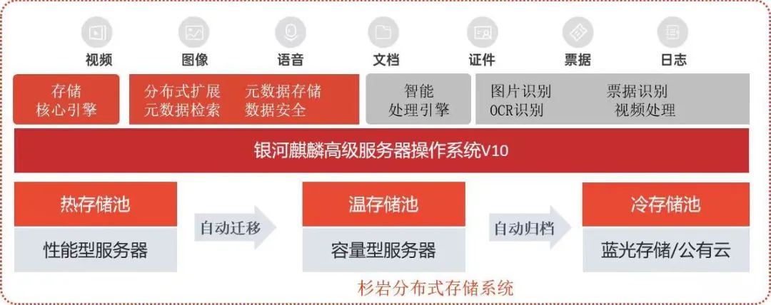 项目以银河麒麟高级服务器操作系统V10版为底层基座,搭载杉岩分布式存储系统,打造数据底座。方案稳定可靠,采用去中心化架构,数据冷热自动分层,策略化管理,自动化存储。