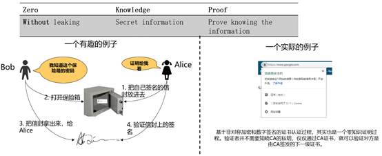 证明者在不泄露任何有效知识的情况下,验证者可以验证某个论断是正确的。图1给出一个有趣的例子,Alice把自己的签名的信封放到一个保险箱中,Bob说他知道这个保险箱的密码,Alice让Bob证明给她看。Bob打开保险箱,把信封拿出来给Alice。Alice验证信封上的签名,确认了Bob确实知道这个密码。这个例子就是Bob没有告诉Alice密码却证明自己知道密码的的过程很好的解释了零知识证明的概念。基于非对称加密和数字签名的证书认证过程,其实也是一个零知识证明的过程,验证者并不需要知晓CA证书,就可以验证对方是由CA签发的下一级证书。零知识证明技术不管应用于金融还是其他领域,都可以对隐私保护,性能提升,或者安全性等场景带来很多帮助。下面,主要从隐私维度来分享华为零知识证明相关技术。