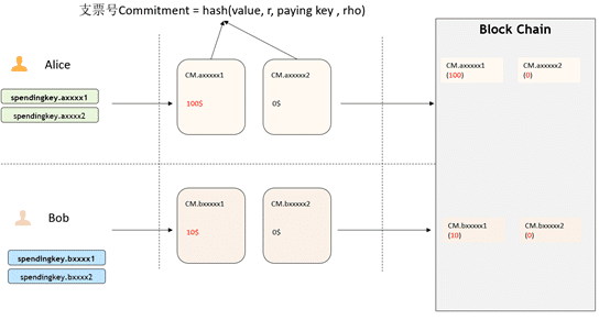 图6包含了对这个余额初始化的过程,生成交易也就是真正转账的过程包含验证,证明,完成验证,生成交易即收款等步骤。拿初始化举个例子,比如说爱丽丝初始化了一个100块钱的一个余额,然后鲍勃十块钱。转账的过程就可以描述为,爱丽丝转20块钱给鲍勃,内部生成一对Spending key / Paying Key ,相当于临时交易的一个账户,Paying Key给对方,Spending Key留给自己,用于证明交易链上的交易是属于谁的。