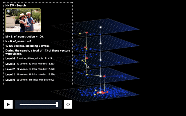 通过交互,我们也可以发现,虽然最开始搜索路径上的节点相关性都较低,但随着搜索的进行,搜索的精度迅速变高。从左侧的统计面板中,我们可以发现,总量超过 17,000 张的图片,实际被访问到的向量(即参与距离计算的向量)只有 143 个,约占总量的 1%,这大大加速了查询的效率,这也是 hnsw 的魔力所在。
