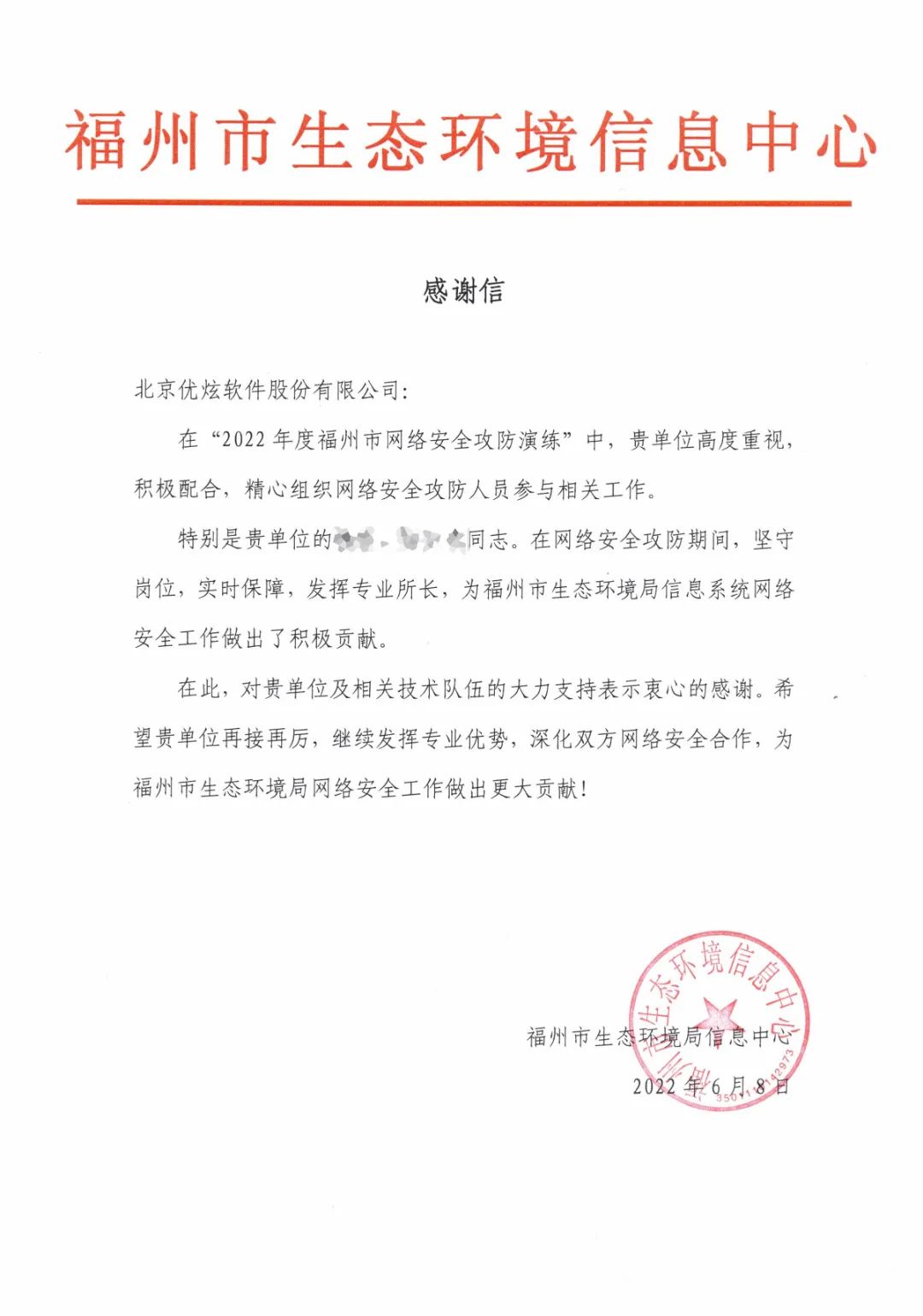 近日,优炫软件分别收到来自福州市生态环境信息中心和福建林业职业技术学院的感谢信,信中对公司全力配合完成网络安全实战攻防演练保障任务,在工作中的担当和贡献表示赞扬。