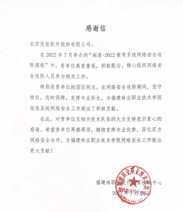 感谢信中写道,网络安全攻防期间,坚守岗位,实时保障,发挥专业所长,为网络安全工作做出了积极贡献。