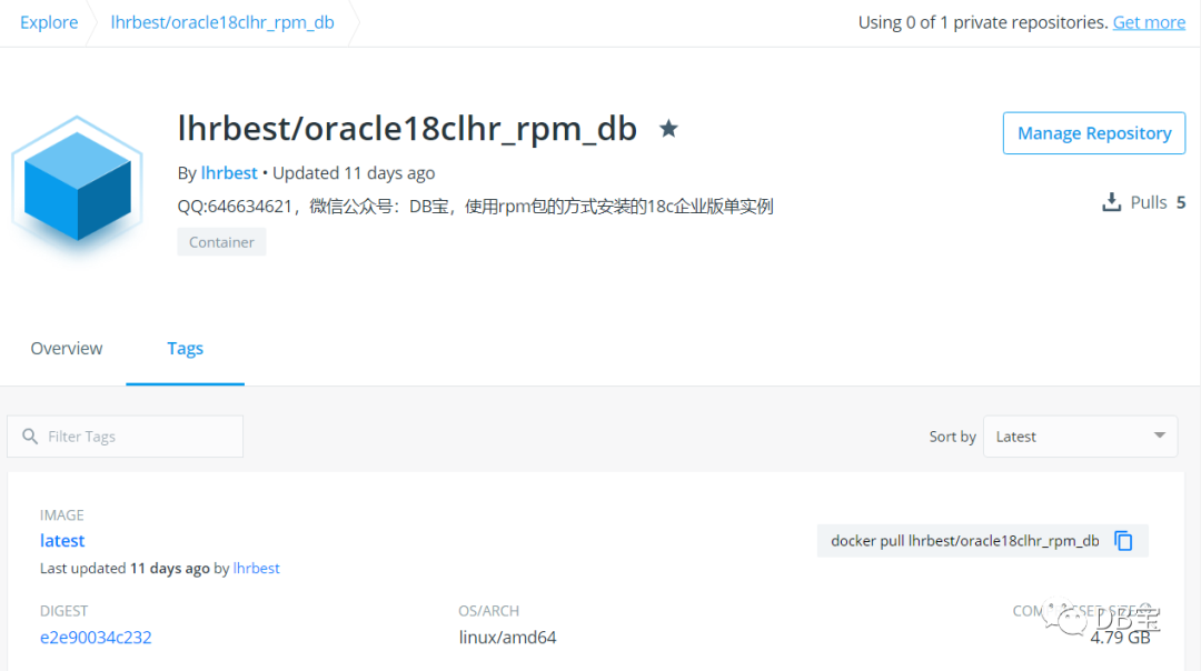 小麦苗的Docker Hub的地址:https://hub.docker.com/u/lhrbest Oracle 18c DB的地址:https://hub.docker.com/r/lhrbest/oracle18clhr_rpm_db/tags
