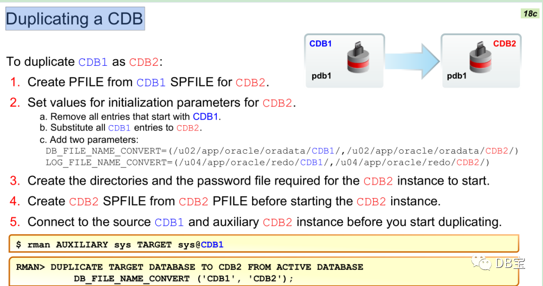 这是Oracle OCP给出的一个duplicating a CDB的一般步骤: